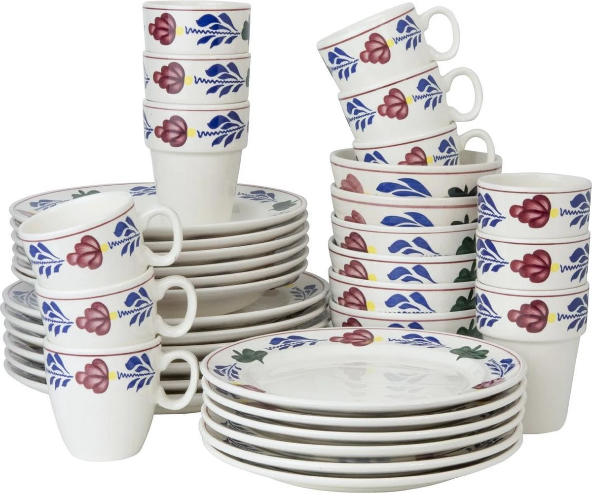 Uitgebreid dineren met familie of vrienden? Dan is deze Boerenbont serviesset precies wat je zoekt. De serviesset is voor 6 personen en bestaat uit: ontbijtborden (21 cm), diepe borden (22 cm), dinerborden (25,5 cm), minimokken pompei (23 cl), kommen (13 cm / 50 cl) en melkbekers (25 cl). Alle onderdelen zijn magnetron- en vaatwasmachinebestendig.