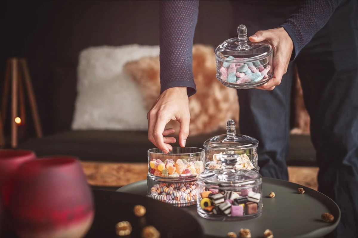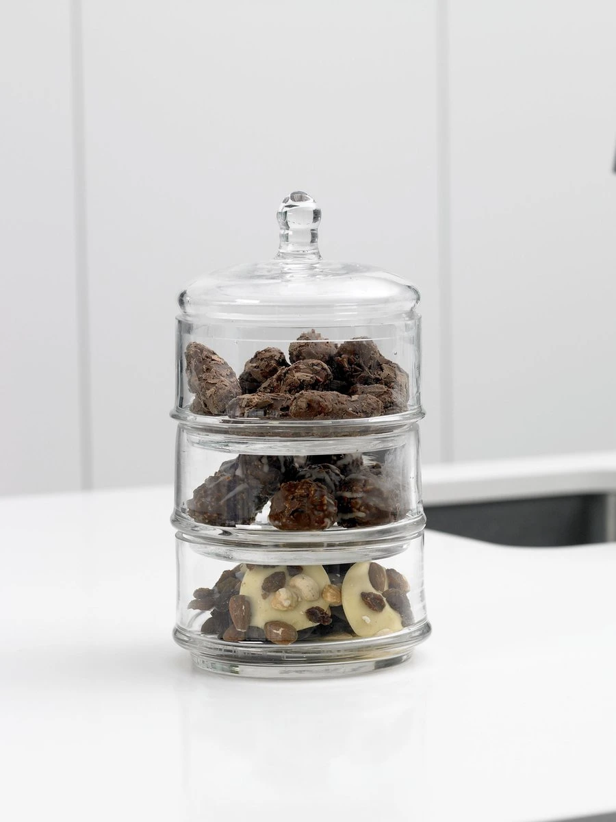 Bonbonnière glas 3-laags van Cosy&Trendy die je permanent in het zicht kunt laten staan, doordat ze zo mooi en decoratief is. In elke schaal kun je een ander type lekkernij bewaren en presenteren.