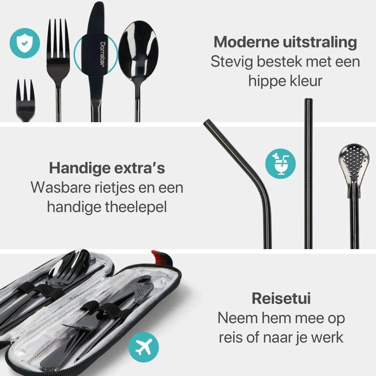 Damster Reisbestek – Verbeterde Versie – Meeneem Bestek Rvs – Reis Bestekset To Go – Incl. Herbruikbare Rietjes – Eenpersoons – Achtdelig – Zwart