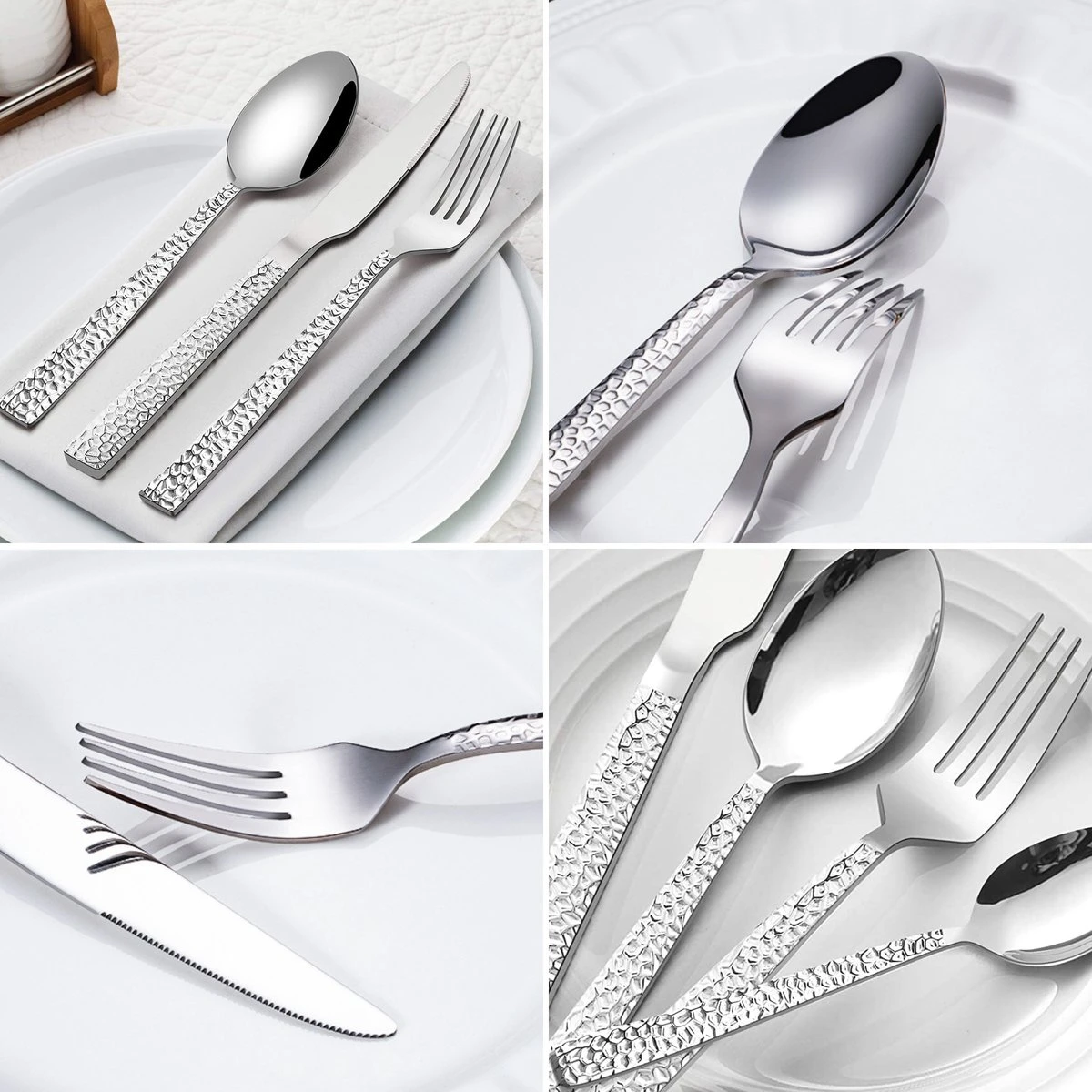 Deze bestekset heeft een prachtige esthetiek met fijne lijnen en een elegant gehamerd ontwerp dat je eettafel zal verheffen, zodat jij een statement maakt bij je gasten. Gemaakt van hoogwaardig 18/0 roestvrij staal dat jarenlang meegaat.