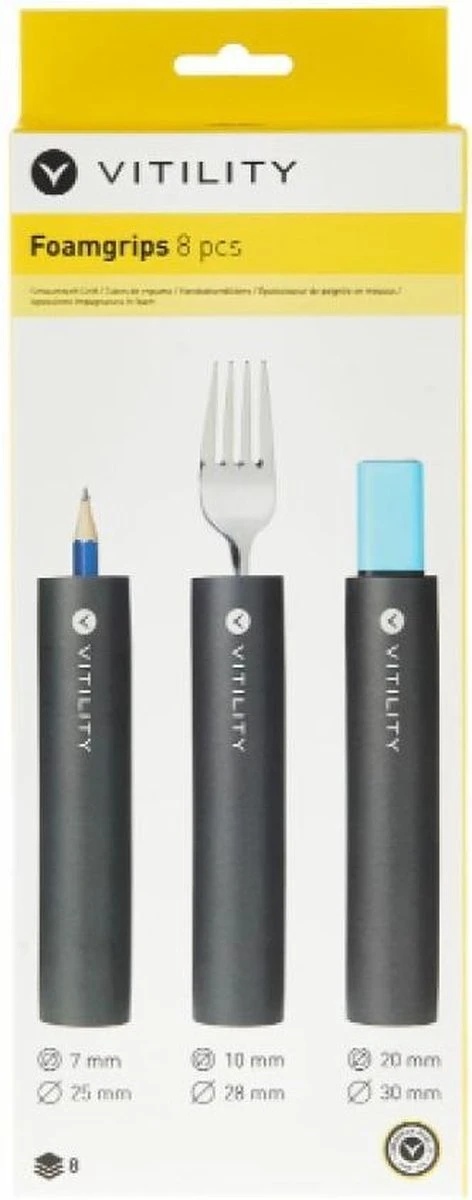 Met de foamgrips verdikt men elk willekeurig handvat, zoals van pennen, potloden, bestek of tandenborstel, waardoor men het voorwerp beter vast kan houden. Verkrijgbaar in 1 lengte van 12 cm, met diverse binnenmaten.
