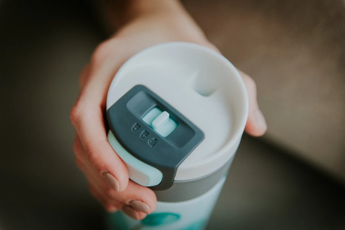 1: Druk’-positie: druk op de knop van onze thermosbeker om een slok te nemen. Nooit meer morsen terwijl je haast naar de volgende meeting of al rennend je trein probeert te halen.
