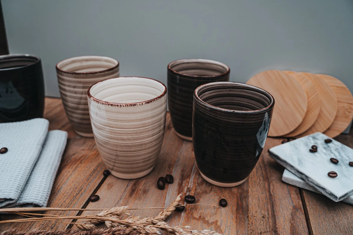 De aardewerk koffiemokken zonder oor hebben een strakke industriele uitstraling waarbij ieder ‘bakje’ of ’taske’ koffie nog lekkerder smaakt!