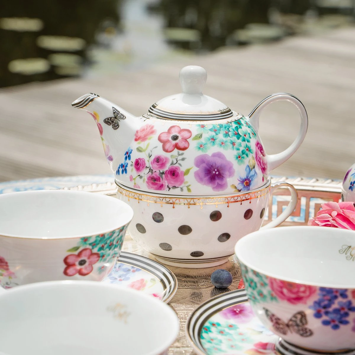 Ben jij een echte theedrinker? Dan is de Melli Mello Tea for One echt iets voor jou. Je hebt namelijk je eigen theepotje en een losse theemok, dus heb je aan 1 kopje niet genoeg? Schenk dan gerust bij! Ook elk theekransje of High-Tea wordt compleet met deze luxe, kleurrijke en romantische Melli Mello Tea for One. De bloemenprint is uitgewerkt in de kleuren roze, blauw, paars en turkoois op een witte basis. Het onmisbare zwart-wit accent op het schoteltje en de oortjes maakt het een fris en modern servies item. Subtiele gouden details stralen luxe uit en maken het plaatje compleet. De Melli Mello Nora Tea for 1 set bestaat uit: schoteltje gedecoreerd met bloemen, een kopje met stippen en een theepot met zwart wit accent. Het heeft een inhoud van 600 milliliter en is gemaakt van porselein. De Tea for one heeft een afmeting van 14x15x15cm.