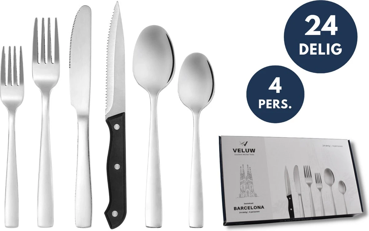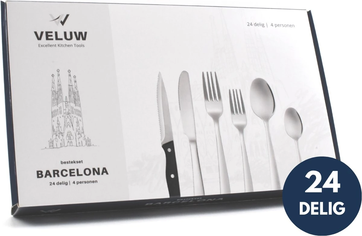 Het Barcelona 24 delige Bestekset voor 4 personen van Veluw is een prachtig bestek voor op de gedekte tafel. Dankzij het moderne, elegante design met hoogglans afwerking is dit bestek een echte eyecather op de tafel. Het Barcelona bestek is geheel gemaakt van 18/0 chroomstaal waardoor het sterk en langdurig mee gaat. Perfect voor dagelijks gebruik met het hele gezin.
